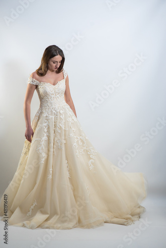 Beauty portrait of bride wearing fashion wedding dress with feathers with luxury delight make-up and hairstyle, studio indoor photo.