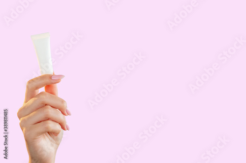Beauty product. Skin care. Organic cosmetology. Wellness hygiene. Minimal presentation of white brand mockup tube with lotion in female hand isolated on pastel pink copy space commercial background.