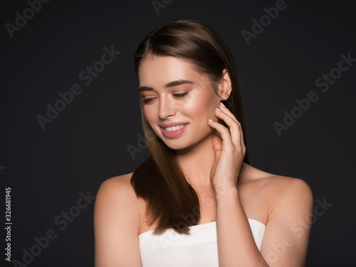 woman, beautiful, beauty, face, eye, skin, clean, make up, natural, brunette, hair, long, female, fresh, body, pretty, smile, model, girl, young, make-up, lip, honed, attractive, spa, cosmetic, happy, white, background, person, care, health, portrait, sensual, healthy, wellness, skincare, glamour, hand, arm, manicure, nail, touching