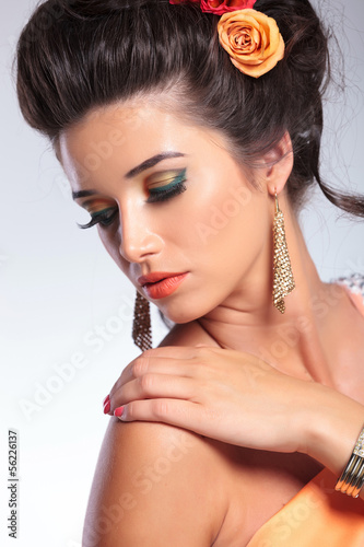 woman, girl, female, fashion, elegant, dress, dramatic, make-up, make up, rose, flower, hair, style, coiffure, beauty, beautiful, attractive, sexy, cute, latin, sensual, grey, grey, background, holding, hand, fancy, posh, posh, heel, looking, look, over, shoulder, back, touching, sensitive, away, down