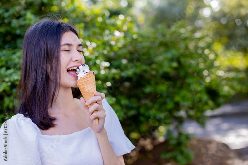 Beauty young woman eating an ice cream. Cheerful young women eating icecream. woman eat ice cream dessert in waffle cone at outdoor.