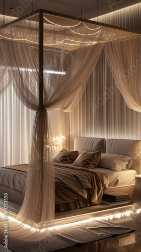 bedroom interior, large bed with transparent canopy, transparent fabrics, lighting, vertical