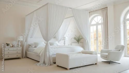 Bedroom with canopy bed, a white bedroom with a canopy bed, bedroom interior, Scandi-style interior in the bedroom, created with generative ai