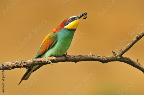 bee-eater, bee-eater, animal, wildlife, bird, fauna, feather, wing, tree branch, nature, colours, colourful, yellow background, bee, feeding, eating