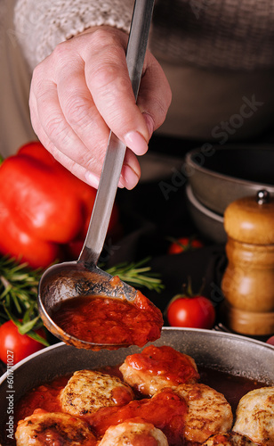 meatball, basil, beef, meat, cook, cooked, cooking, culinary, delicious, dinner, dish, grandmother, food, italian, cookery, food, lunch, meal, meatball, hand, pepper, receipe, red, sauce, tasty, tomatoes, woman, wood, wooden