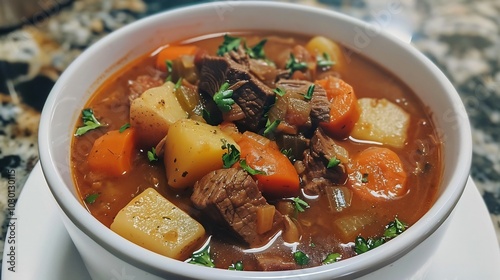 beef, stew, potato, carrot, onion, soup, dinner, food, cookery, culinary, meal, comfort, dish, vegetable, brown, red, orange, white, bowl, ceramic, rustic, home, warm, delicious, appetising, hearty, filling, satisfying, savoury, flavorful, tasty, homemade, cooking, receipe, kitchen, dining, fresh, healthy, alimentary