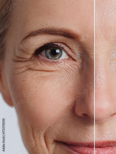 before after aging skin comparison, left side wrinkled fine lines sagging skin, right side firm youthful rejuvenated skin, anti-aging cosmetic advertising