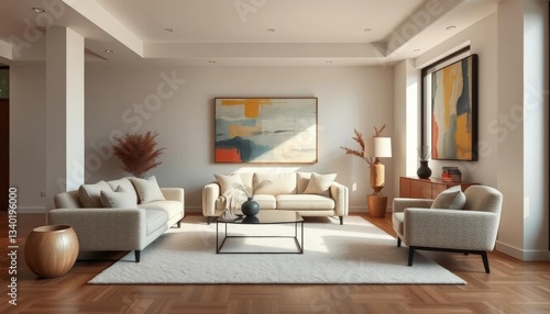 Beige boucle sofa & armchair in minimalist Japandi living room with abstract art, design, mood