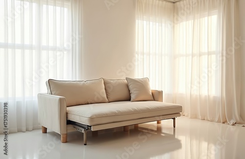 Beige convertible sofa bed with clean lines, neutral tones set in minimalist living space with sheer curtains. Furniture unfolds into spacious sleeping area, perfect for small apartments needing