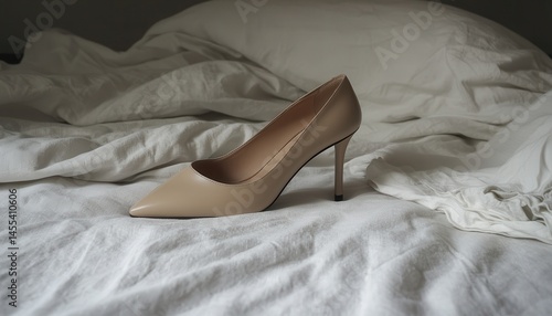 Beige High Heel Shoe on Wrinkled White Bedding
