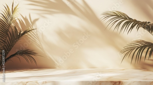 palm, leaf, shadow, light, beige, background, tropical, summer, sun, plant, nature, marble, table, surface, display, product, presentation, minimalist, clean, aesthetic, serene, calm, peaceful, relaxing, warm, cosy, inviting, elegant, luxury, modern, contemporary, simple, neutral, texture, pattern, style, beauty, spa, wellness, freshness
