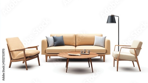 Beige sofa, two armchairs, round coffee table, and floor lamp arranged on white background, creating a minimalist living room setting