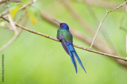 Beija flor tesoura (Eupetomena macroura) de costas pousado em um galho