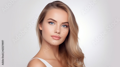 Bela jovem loira com pele perfeita, tocando seu rosto. Tratamento facial. Conceito de cosmetologia, beleza e spa. isolado no fundo branco
