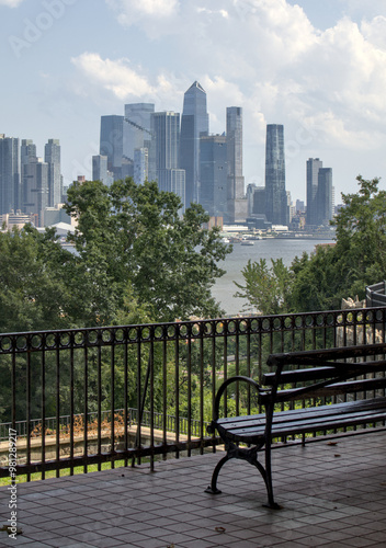 bench in a public park in west new york overlooking midtown manhattan city skyline (nyc skyscrapers seat) new jersey living lifestyle scenic travel destination beautiful vista cityscape downtown