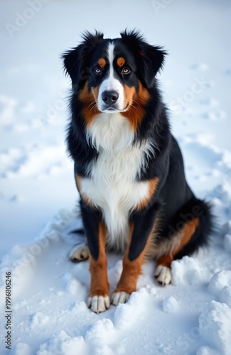 Bernese mountain dog sits calmly on snow covered ground. Tri color canine has fluffy fur coat. Beautiful loyal pet poses for winter photo. Dog looks directly at viewer.