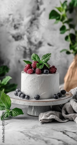 cake, dessert, berry, raspberry, blueberry, white, cream, frosting, sweet, food, pastry, baked, delicious, fresh, mint, leaf, garnish, presentation, table, marble, background, neutral, soft, light, still, life, photo, elegant, simple, rustic, racked, ceramic, decorative, healthy, alimentary, organic, vegan, vegetarian, natural, plant, greenery, brunch, treat, snack, culinary, cookery, deliciously, tempting, beautiful
