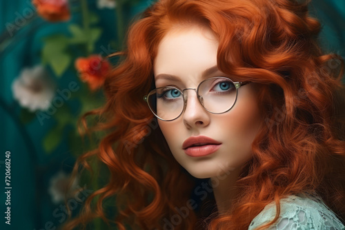 Bespectacled curly red-haired girl, stylish female image. optics, vision correction and eye imperfections. portrait, stunningly beautiful young woman with glasses.