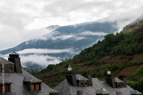 Betren houses with mountains and fog in the background, Val D'Aran, Lleida