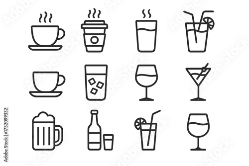 icon, drink, beverage, vector, line, outline, symbol, set, hot drink, tea, beer, wine, cocktail, water, juice, cup, glasses, mug, bar, menu, cafes, eatery, alcohol, collection, graphic, signs, pictogram, simple, minimal, illustration, isolated, hot, cold, bottle, soda, espresso, liquid, ice, straw, design, element, martini, refreshment, party