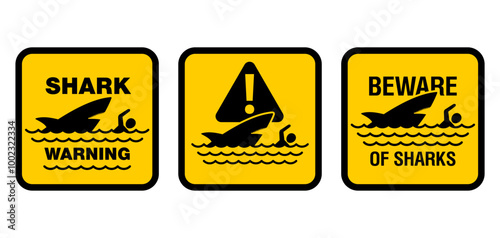 attention, beach, beware, black, caution, collection, danger, dangerous, fish, forbidden, horror, human, icon, illustration, jaw, ocean, people, risk, safety, sea, set, shark, shore, signs, silhouette, square, swim, symbol, vector, victim, warning, water, wave, yellow