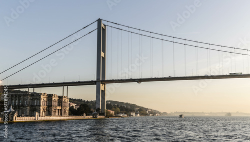 Beylerbeyi Palace under 15 July Martyrs Bridge at sunset. View from touristic boat on Bosporus. Istanbul, Turkey