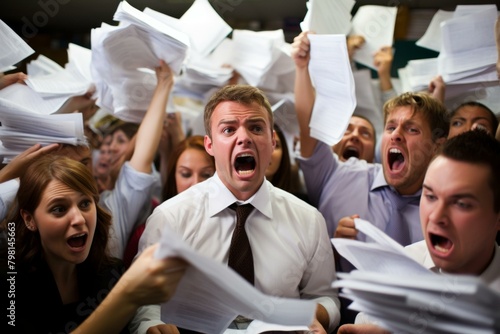work, frustration, stress, paper, yelling, chaos, office, business, people, caucasian, group, 15