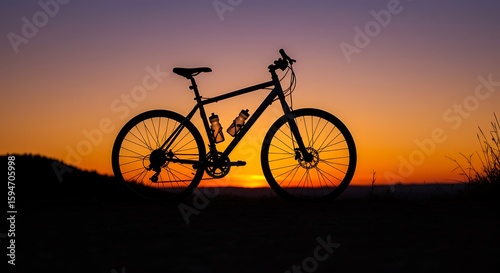 bicycle, cycling, silhouette, sunset, sky, orange, purple, horizon, mountain, hill, grass, landscape, nature, evening, dusk, backlit, bike, wheel, pedal, frame, handlebar, seat, tire, bottle, carrier, mountain bike, travel, recreation, sport, exercise, fitness, adventure, scenic, tranquil, peaceful, vibrant, dark, light, ride, road, terrain, background, day, warm, lifestyle, activity, gear, transport