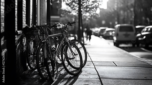 Bicycles Parked on City Sidewalk in Black and White with Sunlight