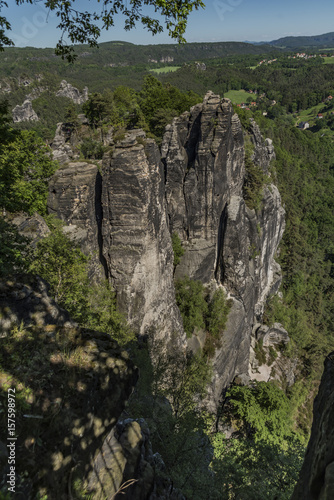 Big rocks near Bastei bridge in valley of river Elbe