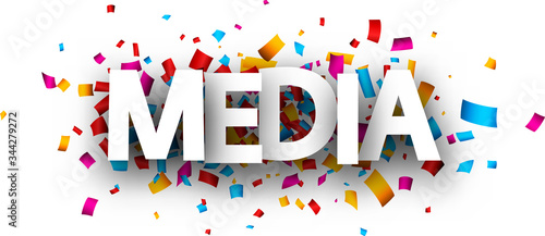 Big white media sign over confetti background.