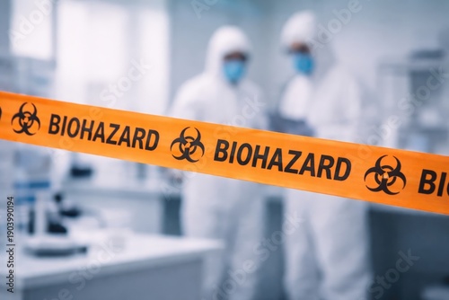 Biohazard warning tape in a laboratory setting with two individuals in protective suits and masks working in the background, emphasizing safety protocols and containment measures