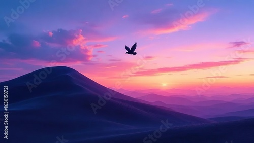sunset, bird, sky, mountain, landscape, cloudscape, silhouette, nature, horizon, evening, pink sky, purple sky, mountain chain, dramatic sky, twilight, atmospheric