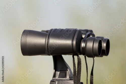 Bird watching with binoculars on tripod, spending time in nature birdwatching at the river with birding equipment, optics