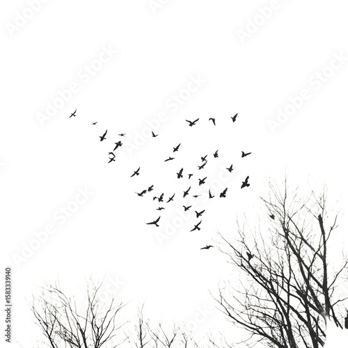 bird, flight, sky, monochrome, black, white, nature, wildlife, winter, branch, tree, flock, avian, feather, wing, movement, serenity, peace, freedom, wild, beauty, minimalist, abstract, background, texture, landscape, photo, art, image, picture, graphic, design, scene, view, natural, environment, ecosystem, animal, life, season, cold, tree branch, skyline