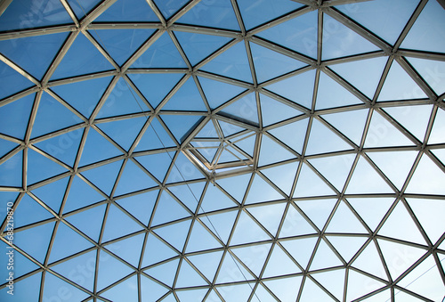 view, abstract, background, glasses, window, pattern, architecture, ceiling, building, resort, vacation, holiday, sky, blue, sunny, day, lithuania, europa, geometry, triangle, transparent, steel, metal, structure, roof, construction, dome, design, high