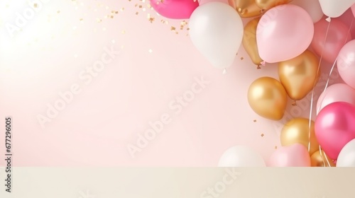 Birthday background with balloons, gold and pink, large copyspace area