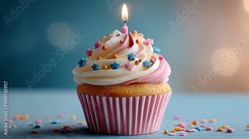 cupcake, birthday, sprinkle, sweet, dessert, cake, party, fun, celebration, festive, pink, white, cream, decorated, delicious, treat, tasty, deliciously, sweetness, happy, candle, light, flames, enjoy, joyful, childhood, cup, food, whipped, colourful, sugar, joy, pretty, image, elegant