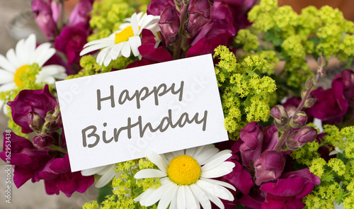 greeting card, happy birthday, birthday, text, writing, english, welcome, congratulation, birthday card, flower, daisy, map, summer flowers, nature, bouquet, red, white, green, summer