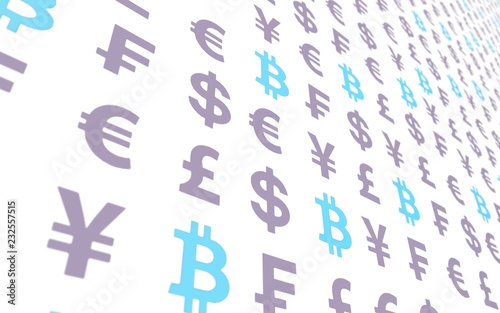 Bitcoin and currency on a white background. Digital Cryptocurrency symbol. Business concept. Market Display. 3D illustration