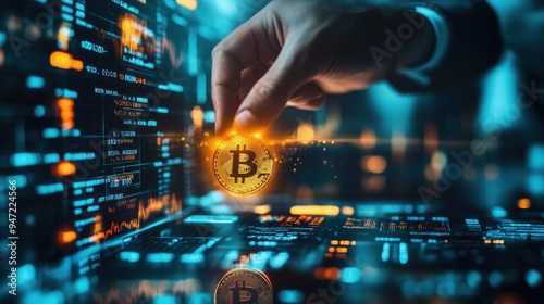Bitcoin Investment: Hand placing glowing Bitcoin cryptocurrency coin onto a futuristic digital screen. Blockchain technology, financial innovation, and digital currency concepts are vividly depicted.