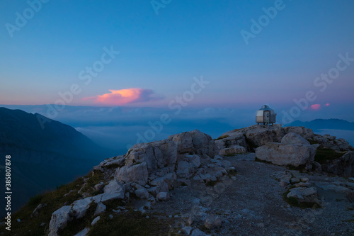 Bivouac on mountain peak against blue sky at dawn, Bergamasque Alps, Italy