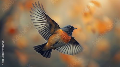 Black and orange bird with spread wings flying in motion through a blurred autumn leaves.