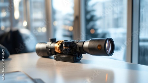 Black and Orange Optical Device on a Light Surface with Blurred Indoor and Window Background