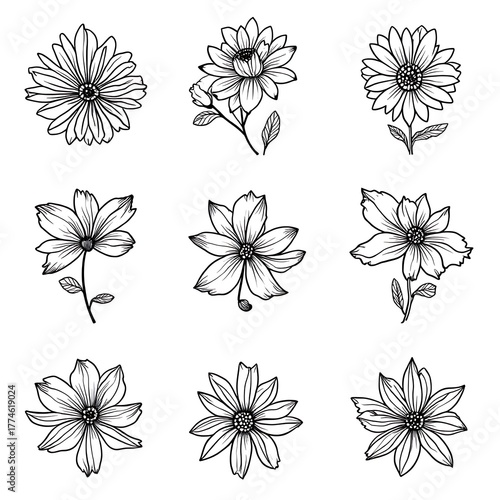 Black and White Floral Illustration Set of Nine Different Flower Drawings