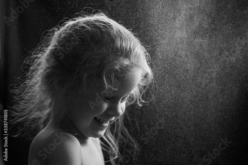 black and white frame: portrait of a little girl under the spray on a black background