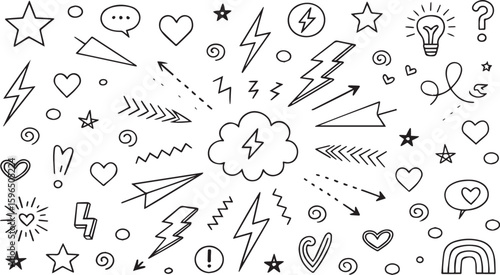 doodle, hand-drawn, black-and-white, lightning bolt, nubes, star, light bulb, idea, inspiration, energy, power, love, celebration, abstract, graphic, design, element, symbol, icon, pattern, background, simple, vignetting, drawing, illustration, creative, communication, speech bubble, arrow, rainbow, exclamation mark, question mark, swirl, zigzag, circle, outline, graphic design, vector, isolated, white background, graphic elements, design element, artistic