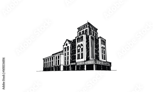 Black and white illustration of a large gothic-style building with tall tower. Vector retro hand drawn illustration
