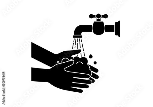 hygiene, cleanliness, water, soap, faucet, hand, washing, prevention, health, sanitation, illustration, black, white, icon, graphic, symbol, vector, care, routine, personal, public, safety, protection, germ, virus, disease, clean, tap, dripping, foam, bubble, liquid, flowing, drop, sanitize, health care, medicals, awareness, education, procedure, lifestyle, well-being, precaution, graphic design, artwork, clip art