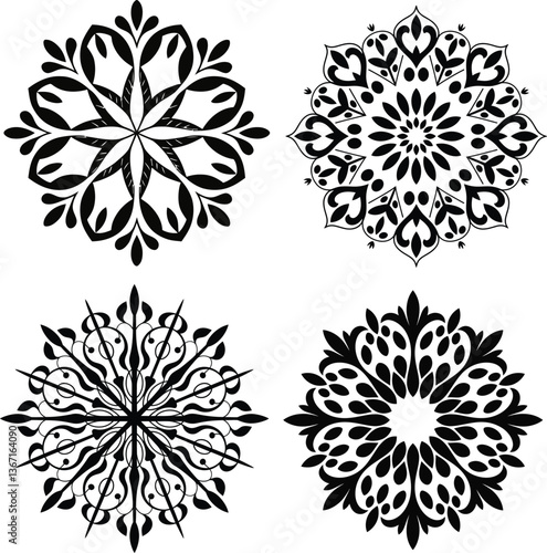 black-and-white, floral pattern, isolated, ornamental, hinduism, colouring, unique, print, symbol, design, pattern, mandala, vector, decoration, ornament, floral, white, drawing, abstract, element, ethnic, round, graphic, symmetry, decor, style, decorative, background, motif, traditional, tattoo, template, meditation, card, flower, vignetting, silhouette, flower, illustration, circle, texture, simple